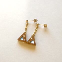 イエローブラウン&ナチュラル色の木材に浅葱色の和紙を組み込んで、ちいさなスワロフスキーをあしらった三角チャームの木製ピアスです。