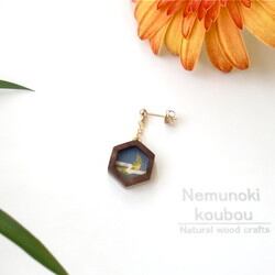チョコレート&ナチュラル色の木枠に和紙の”はり絵”を組み込んだ木製チャームのハーフピアスです。